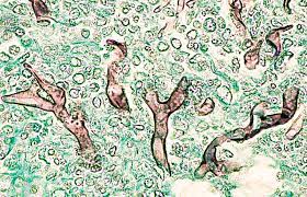 The disease begins to manifest as a skin infection within the air pockets located behind the forehead, nose, cheekbones and in between the eyes and teeth. It then spreads to the eyes, lungs and may even spread to the brain. It results in blackening or discoloration over the nose, blurred or diplopia , pain , breathing difficulties and coughing of blood.